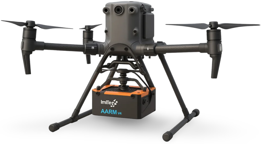 The Imitec AARM system's payload box is its essential component, housing the advanced technology that makes 3D radiation mapping possible. This compact unit contains specialized gamma spectrometers and precise positioning sensors, meticulously designed for lightweight integration onto the drone.